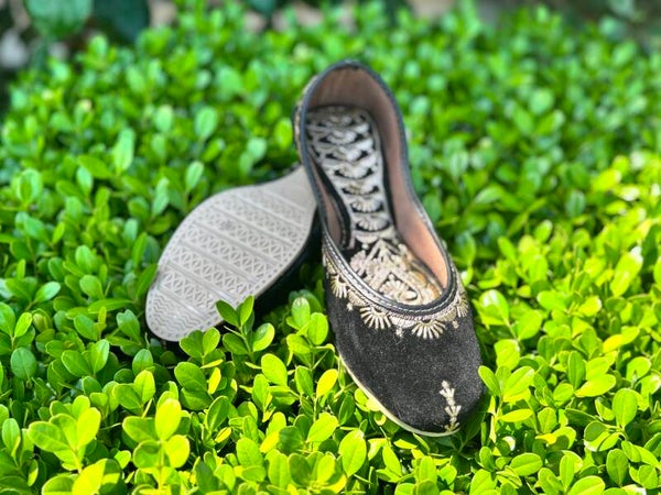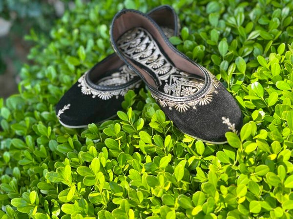 Embrace timeless elegance with Midnight Majesty, a luxurious pair of black velvet juttis adorned with intricate silver-gold embroidery. The bold contrast of deep black and metallic threadwork makes these flats a versatile choice—perfect for festive wear, formal events, or elevating a classic monochrome outfit.