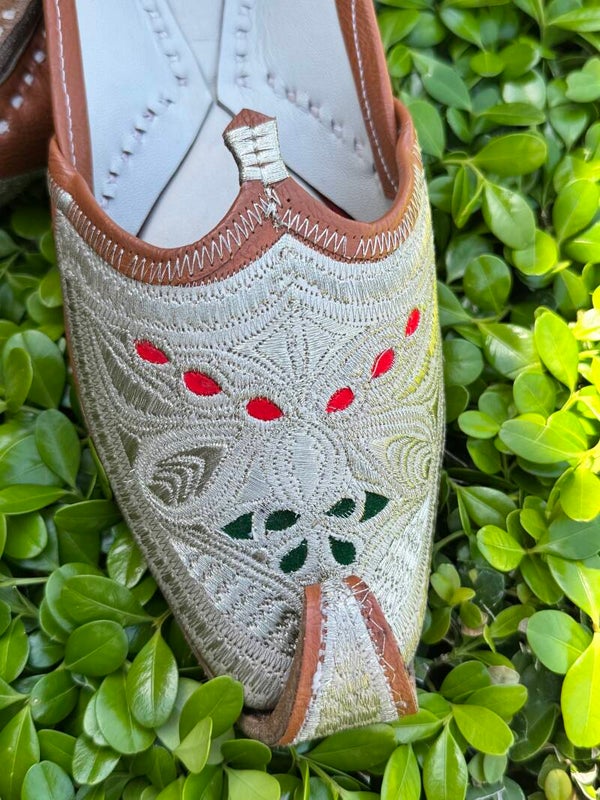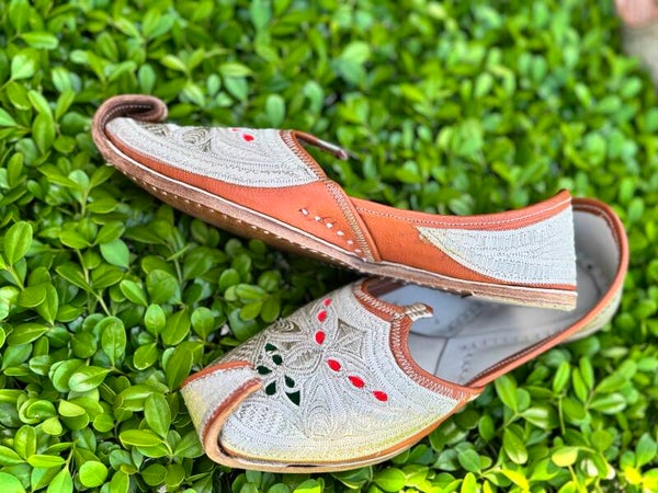 Bring a splash of regional flair to your look with the Mens Embroidered Nokdar Jutti. This pair showcases intricate white threadwork featuring floral and geometric patterns, punctuated by bold red and green cutwork accents. The contrast of vibrant embroidery against a neutral base creates a statement that's both festive and refined.