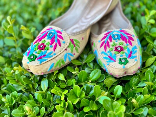 Bring a burst of tropical vibrance to your step with the Tropical Tapestry juttis. These handcrafted flats feature bold hand embroidery in hot pink, electric blue, forest green, and turquoise on a warm beige base – perfect for making a statement without saying a word. Designed for both comfort and flair, they're your go-to choice for vacations, brunch dates, or vibrant casual days.