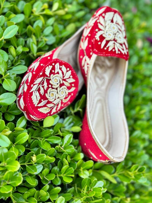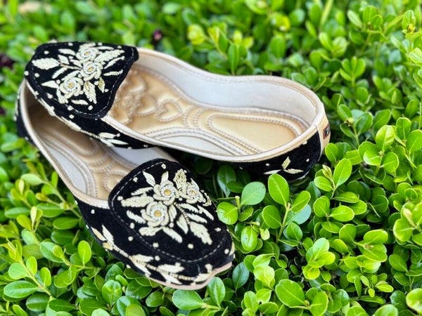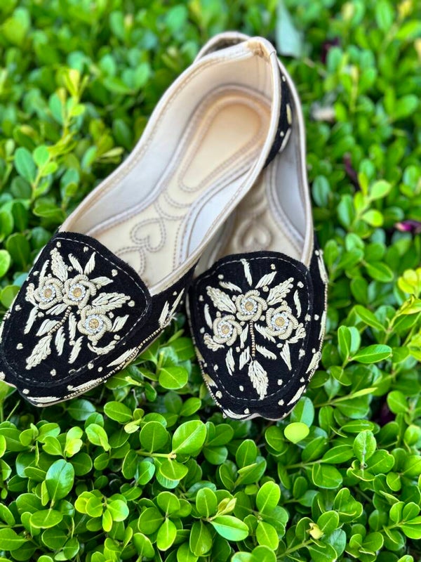 Elevate your ethnic wardrobe with the timeless elegance of the Royal Duo Embroidered Velvet Juttis. Available in Crimson Red and Midnight Black, each pair showcases intricate golden floral embroidery accented with delicate white threadwork. The ornate detailing on plush velvet fabric adds regal charm, ideal for festive events, weddings, or traditional celebrations.