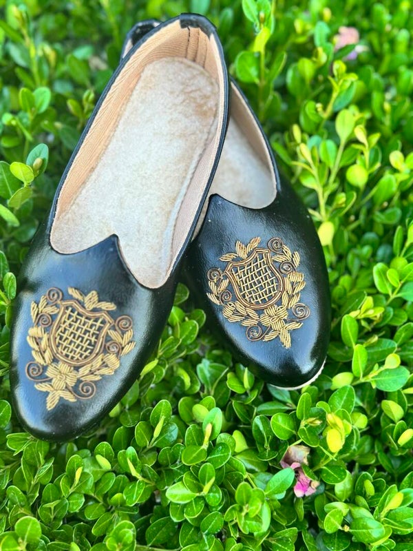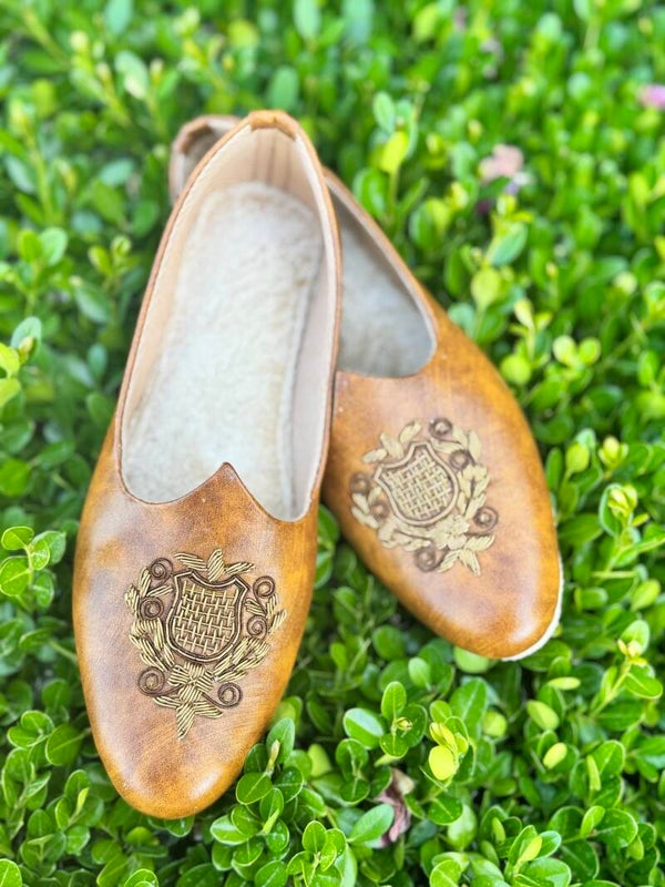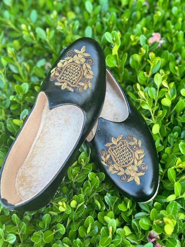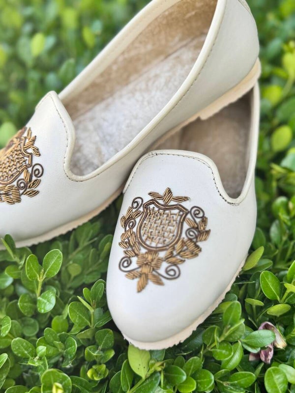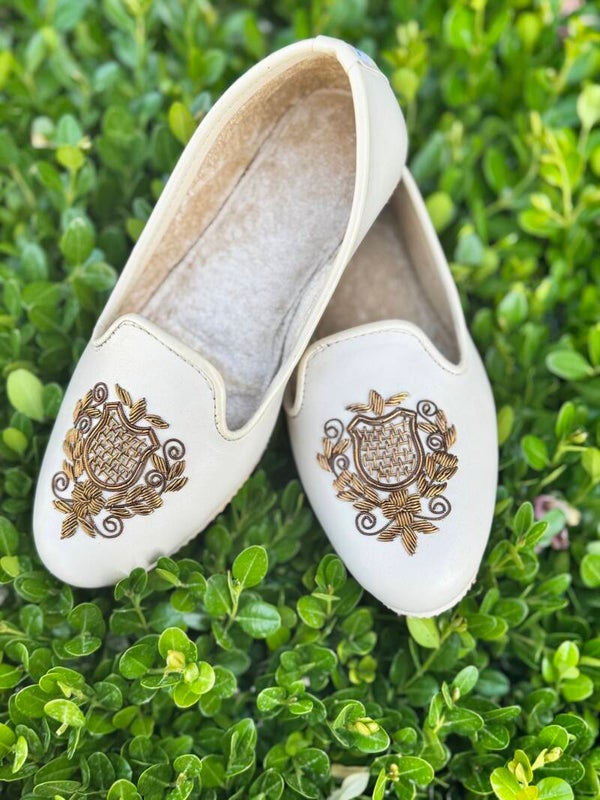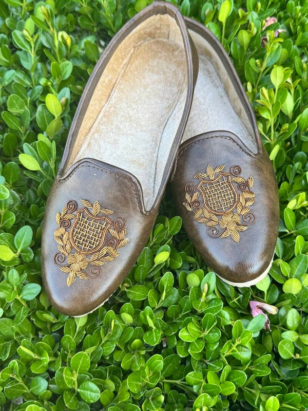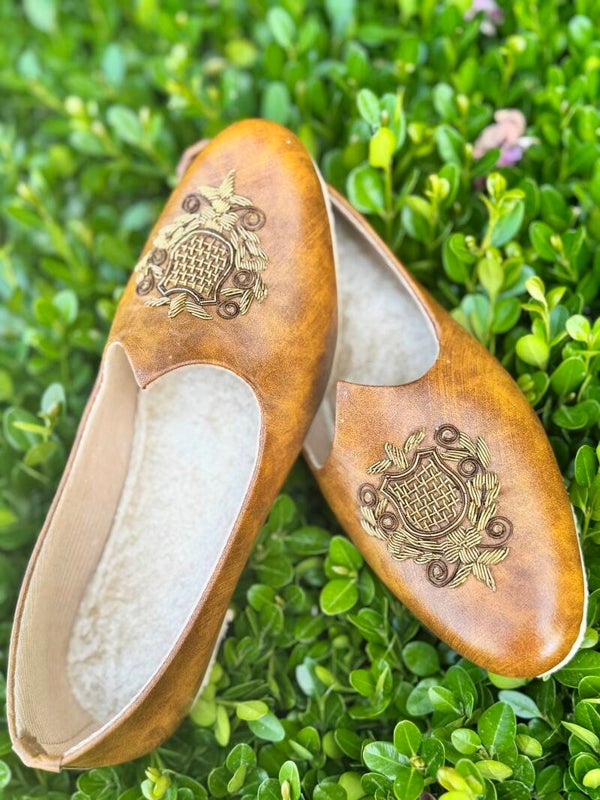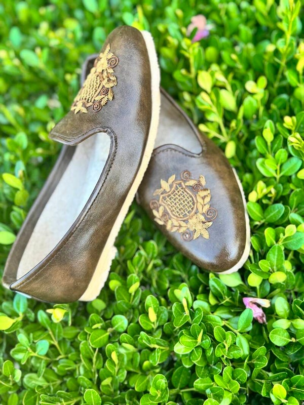 Step into tradition with the Royal Heritage Khussa - Handmade Dabka Work, a luxurious footwear choice blending royal heritage with modern comfort. These slip-ons are adorned with intricate gold crest Handmade Dabka embroidery, symbolizing elegance and legacy. Featuring a heart-shaped vamp and a plush inner lining, they're perfect for weddings, festive wear, or grand cultural occasions.