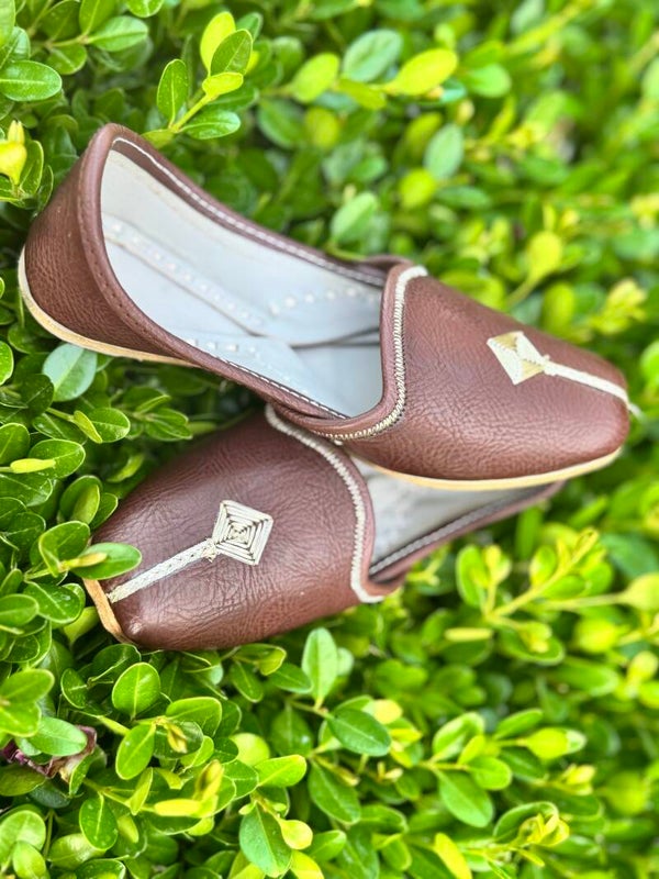 This brown Jutti features a subtle, textured leather finish with cream thread detailing in a clean, pointed design. A balanced blend of simplicity and elegance, perfect for daily ethnic wear or light festive occasions.