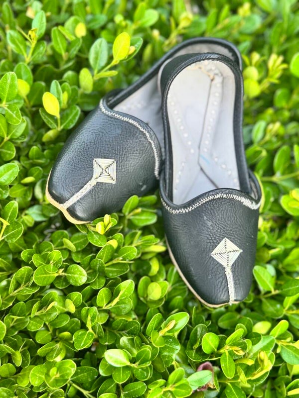 Classic black Jutti crafted from textured leather and highlighted with a sharp central stitch and diamond motif. The neutral tone makes it ideal for both traditional and semi-formal outfits.