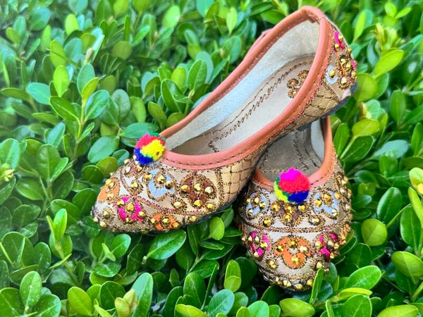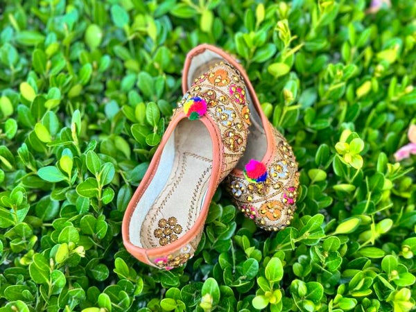 Give your baby girl a touch of royal elegance with the Royal Marigold Jutti. This pair dazzles with gold thread embroidery, mirror detailing, and a colorful pom-pom for playful charm. The warm golden-brown base makes it a timeless accessory for weddings, ethnic events, or Diwali celebrations. Soft cushioned insoles provide all-day comfort for tiny feet.