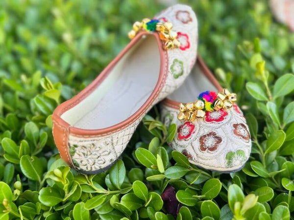 Elegant beige juttis adorned with intricate floral embroidery in red, green, and brown tones. Finished with a delicate leather trim and embellished with golden ghungroos and a vibrant multicolor pom-pom for a playful ethnic touch. Perfect for festive occasions or casual ethnic wear.