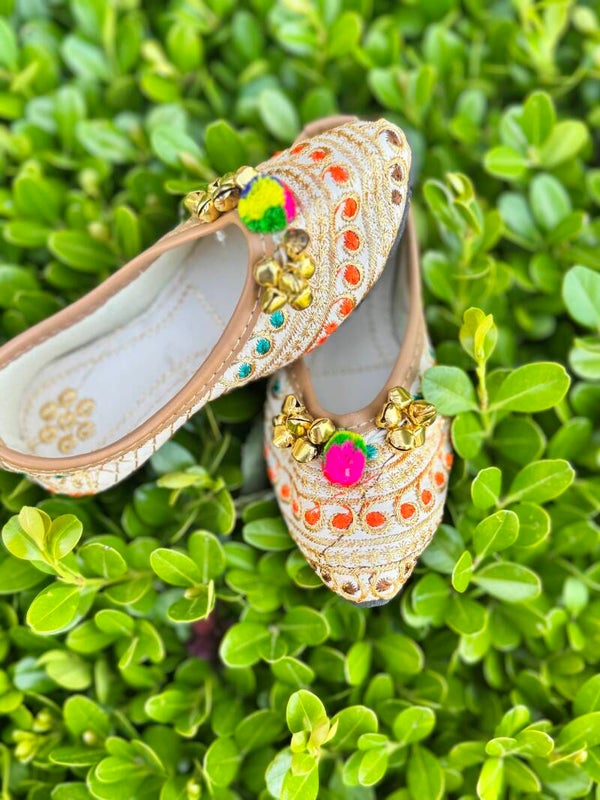 A vibrant pair of juttis featuring warm orange, gold, and turquoise embroidery on a shimmering base. The golden bells and neon pom-poms add a cheerful jingle to each step. Ideal for weddings, sangeet nights, or colorful festive outfits.