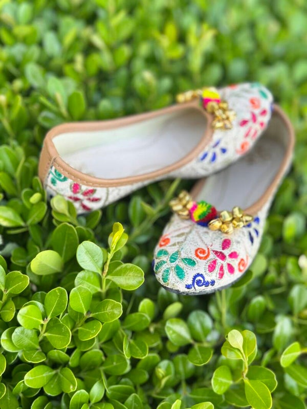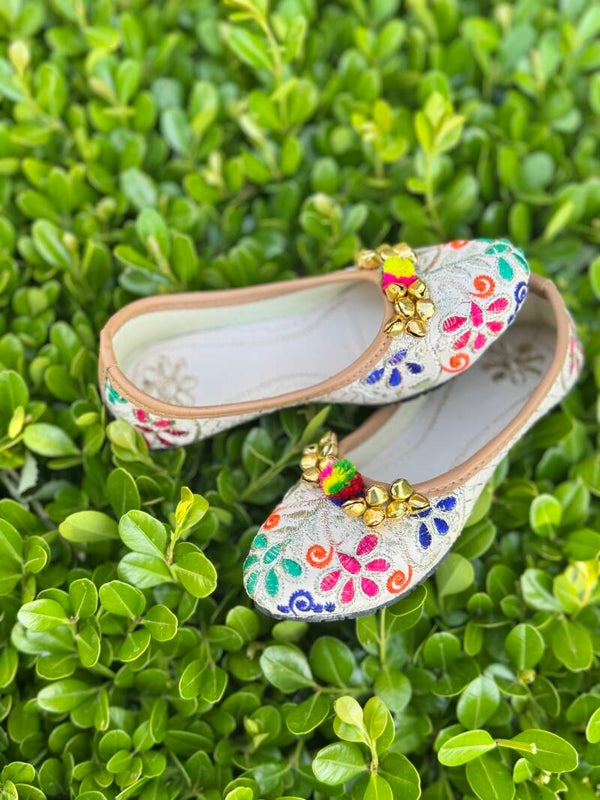 Featuring leaf-like embroidery in bold hues of blue, pink, green, and orange, these juttis are reminiscent of peacock feathers. Set against a champagne-gold base with metallic threads, and adorned with golden bells and a colorful pom-pom, they blend elegance with fun.