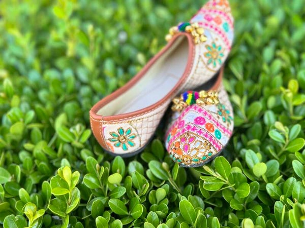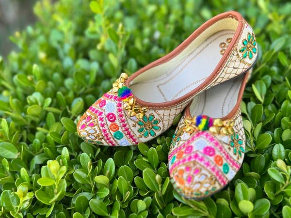 Inspired by the grandeur of royal palaces, the Rang Mahal juttis are designed to turn heads. Intricately embroidered with bright florals and mirror detailing, this pair sparkles with gold embellishments that catch the light beautifully. An ideal choice for special occasions—comfortable enough for dancing, stunning enough for photos.