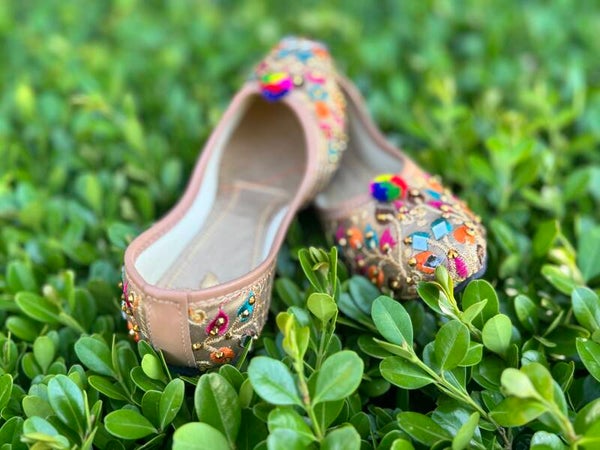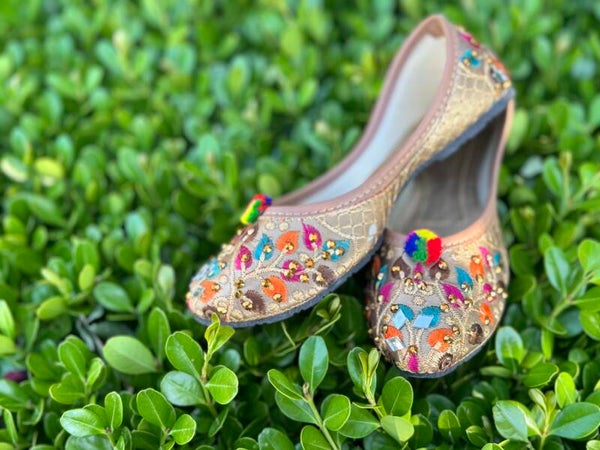 Bursting with color and texture, the Gul Bahar juttis are designed for little trendsetters. Handcrafted with intricate threadwork, mini mirrors, sequins, and a vibrant pom-pom, this pair captures the magic of Indian crafts. Lightweight and soft on tiny feet, they’re a joyful match for ethnic outfits and festive fun.